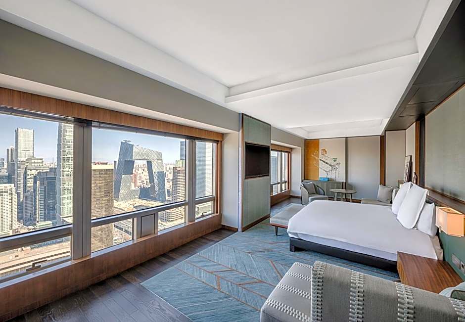 Relish in magnificent panoramic views of Beijing’s CBD and the iconic CCTV Tower from the Park View Room, equipped with a PM2.5 air purification system. All Park View Rooms emanate a unique blend of modernity and comfort, designed in a soft and neutral color palette. Each 45 square-yard room features an open bathtub concept, and a king bed with 400-thread-count linens and down duvet, a large 55-inch interactive smart TV. Universal power adapter outlets and Internet broadband access provide the convenience of a home away from home.